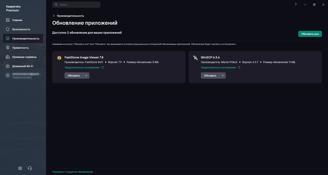 Также предусмотрена возможность узнать про вышедшие обновления используемого ПО и установить их буквально одним кликом мышки. Современные версии ПО – это не только вопрос актуальности их функций, но и залог стабильности и безопасности: при обновлении разработчики устраняют известные баги, закрывают «дыры» в безопасности. В ходе тестирования Kaspersky Premium предложил нам обновить две программы, что мы с удовольствием и сделали. Установка прошла корректно, никаких проблем не возникло.