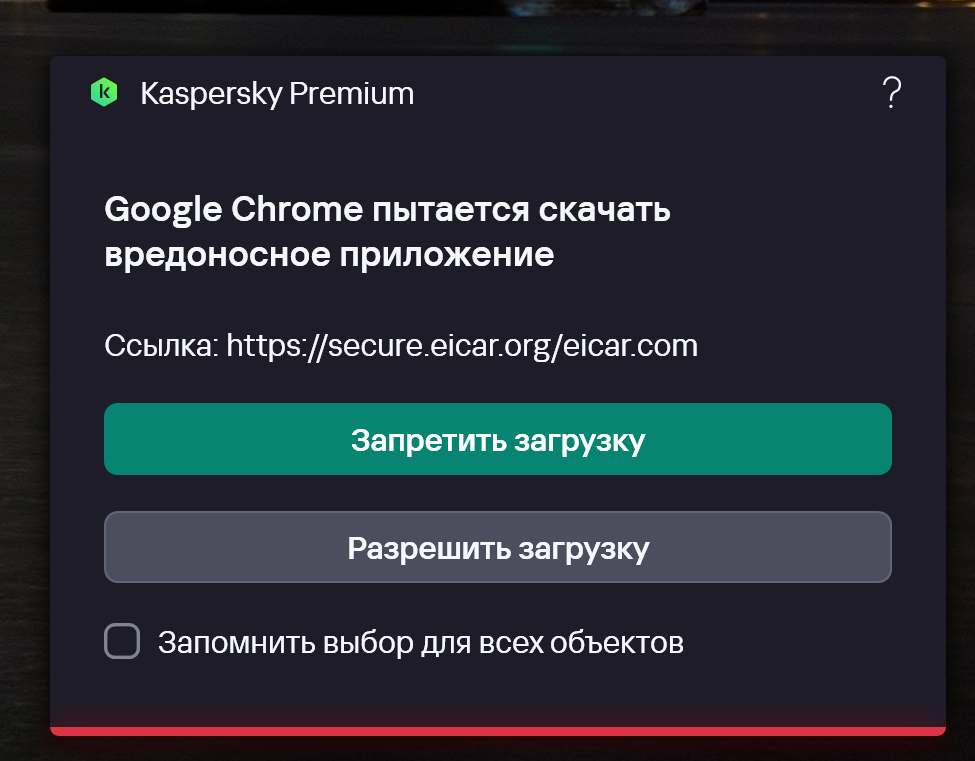 Доверимся данным лабораторий, но все же посмотрим, как Kaspersky Premium реагирует на вредоносные файлы. Для этого воспользуемся тестовой программой Eicar, которая по сути не является вредоносной – просто выводит текстовое сообщение и возвращает управление операционной системе. Разработчики программ для защиты от интернет-угроз делают так, чтобы их продукты реагировали на нее как на вирус, чтобы пользователи могли посмотреть, что происходит при ее обнаружении: какие сообщения выводятся, какие действия предлагается совершить.