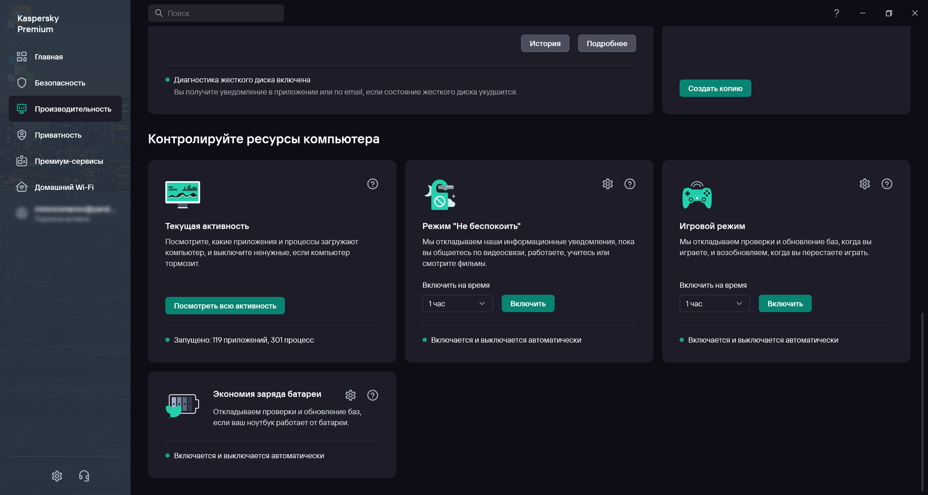 На той же вкладке можно воспользоваться диспетчером задач с приятным и понятным интерфейсом, включить игровой режим (в нем решение не запускает задачи проверки и обновления, не отображает уведомления) и так далее.