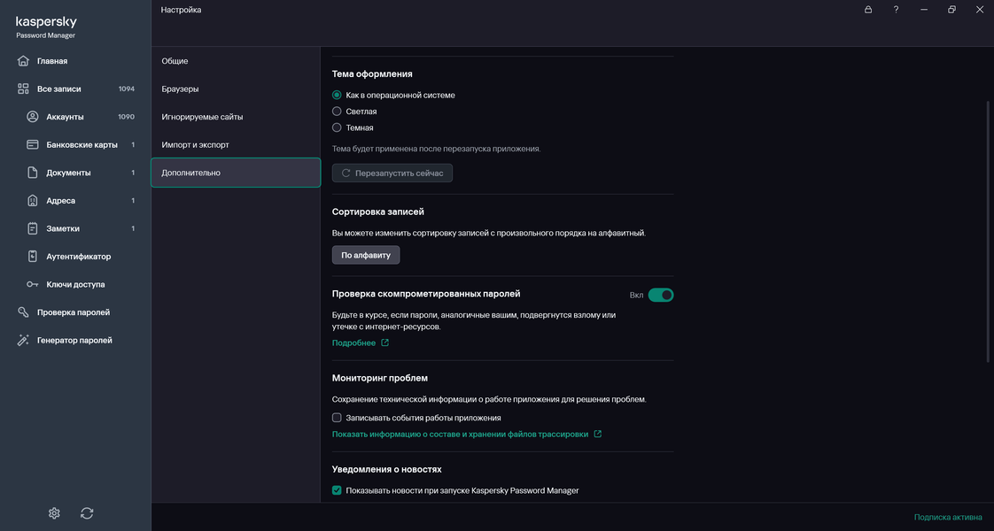 На странице собственных настроек приложения можно добавить сайты, которые будет игнорировать система сохранения и подстановки паролей, настроить внешний вид, изменить сортировку записей, отключить ряд служб и так далее.