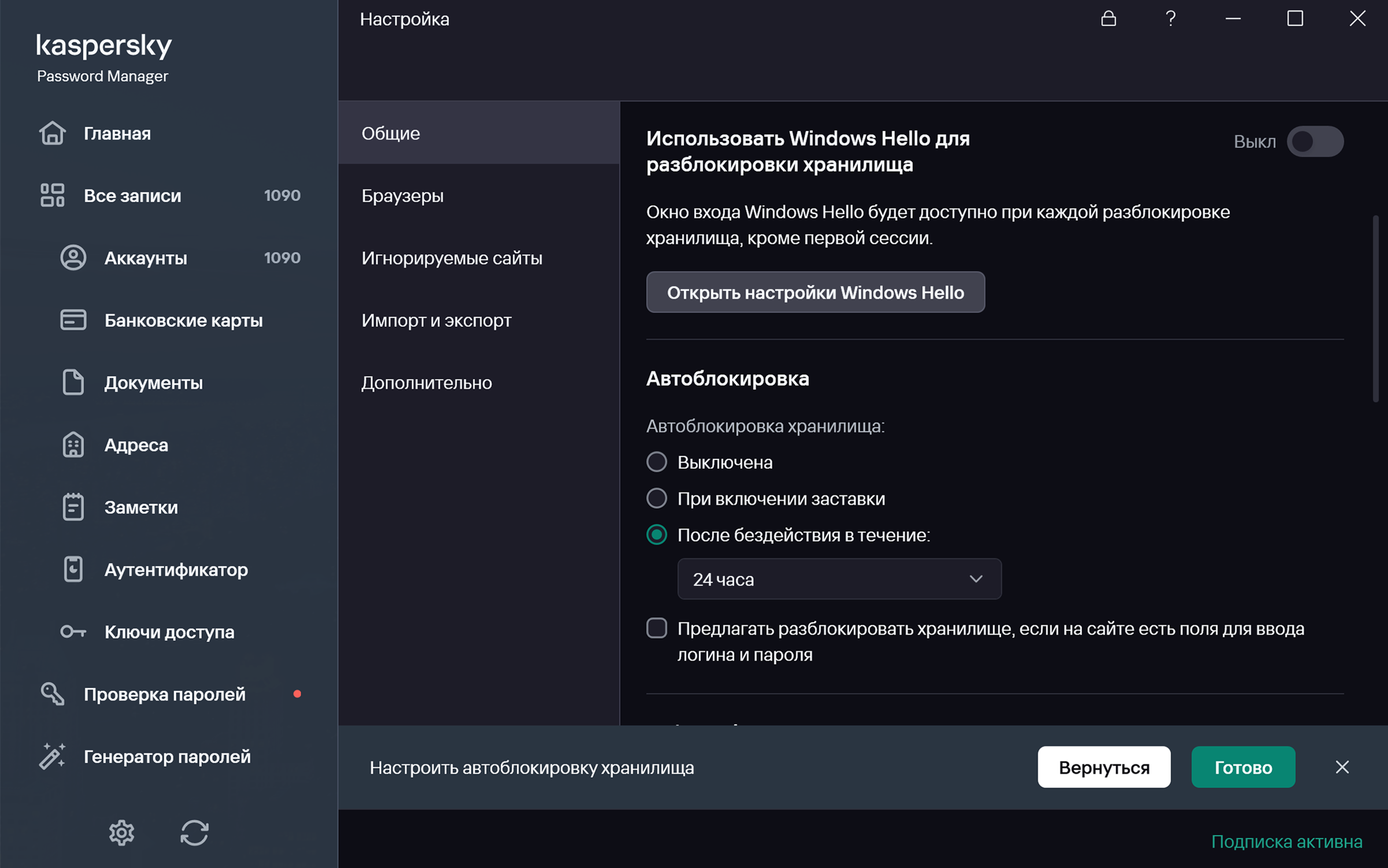 По умолчанию хранилище остается «открытым» довольно долго – можно сократить это время, добавить блокировку при включении заставки, а также использовать Windows Hello для разблокировки – будет совсем удобно. Сразу после установки приложения начинает работать автозаполнение различных полей при регистрации аккаунтов, проведении платежей и так далее – всем, кто использовал современные браузеры, эти возможности хорошо знакомы. Здесь практически то же самое, только безопаснее, надежнее, с дополнительными функциями и широкими возможностями синхронизации между устройствами.