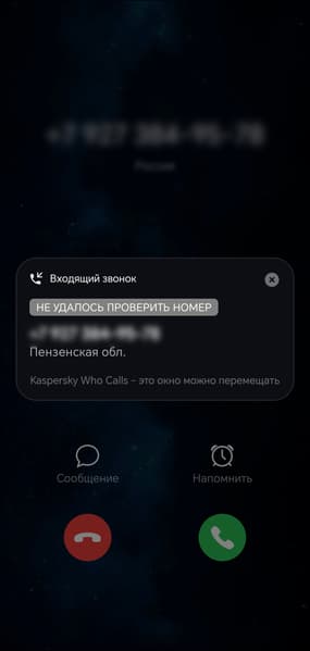 Но самое важное – это, конечно, всплывающее окно, появляющееся при поступлении звонка. Если номер уже замечен системой как нежелательный – приложение об этом сообщит, в остальных случаях будет указано, что проверить номер не удалось. На самом деле, отсутствие номера в базе доверенных – уже повод немного насторожиться, так же стоит обращать внимание на регион, из которого поступил вызов – мы вот, например, совсем не ждали звонков из Пензенской области.
