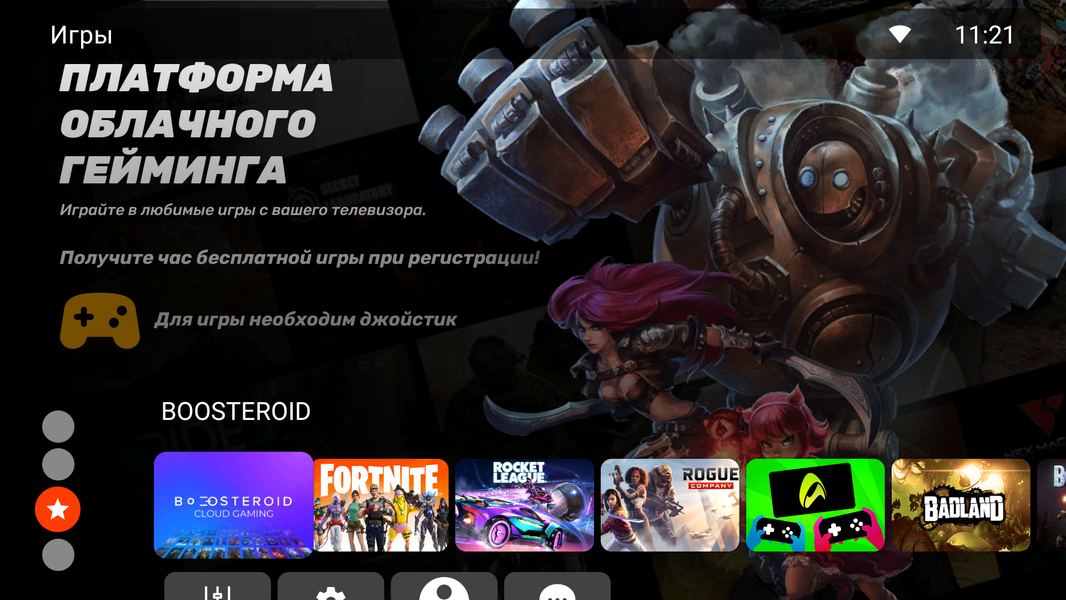 Игры: раздел разработан в сотрудничестве с сервисом Boosteroid. Его технология позволяет запускать требовательные современные компьютерные игры просто на телевизоре: игра работает на собственных сервисах партнера, а игровой процесс передается через интернет на экран пользователя, который контролирует игру со своего устройства, например, с геймпада.