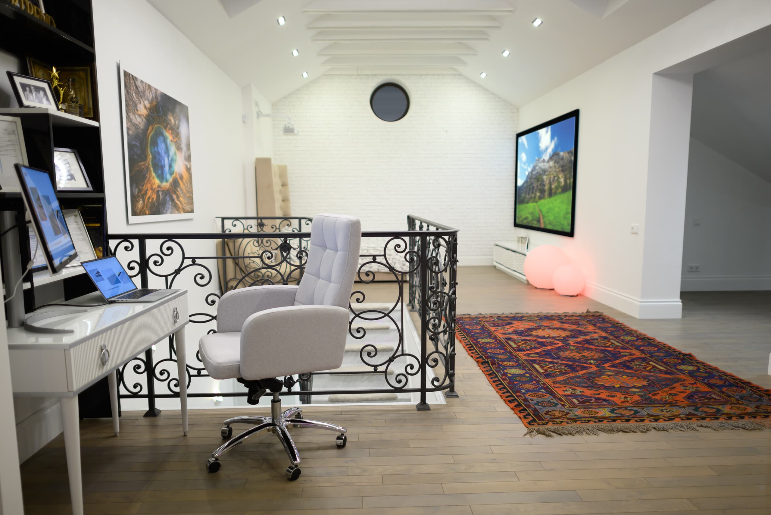 В другой части мансарды расположен семейный рабочий кабинет. Дина учится на маркетолога и помогает семейному бизнесу, поэтому мама и дочка часто занимаются подготовкой кейсов, составлением и переносом таблиц, просмотром фото- и видеоматериалов. Дина, студента второго курса Британской школы дизайна, учится на факультете маркетинга и готовит презентации для защиты во время учебы.