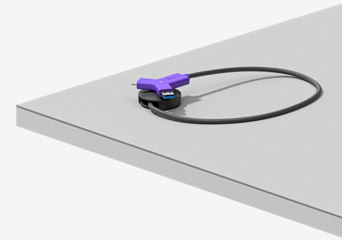 На одном конце Swytch находится компактный разветвленный коннектор — USB-C или USB-A, на выбор. С помощью только него одного вы можете подключить ноутбук к камере, микрофону, акустике и экрану в конференц-зале — другие провода или адаптеры искать не придется, так как они уже подключены к Swytch.