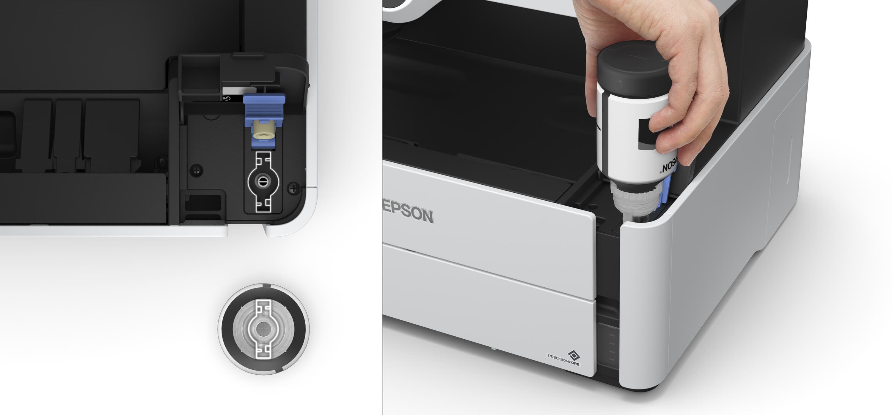 Благодаря специальному клапану Ink Lock в контейнере чернила не прольются, а вы не испачкаетесь.