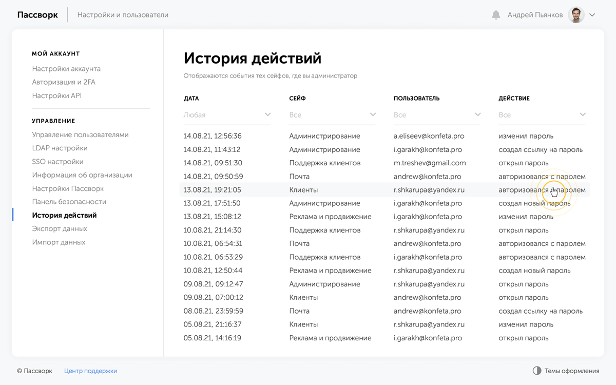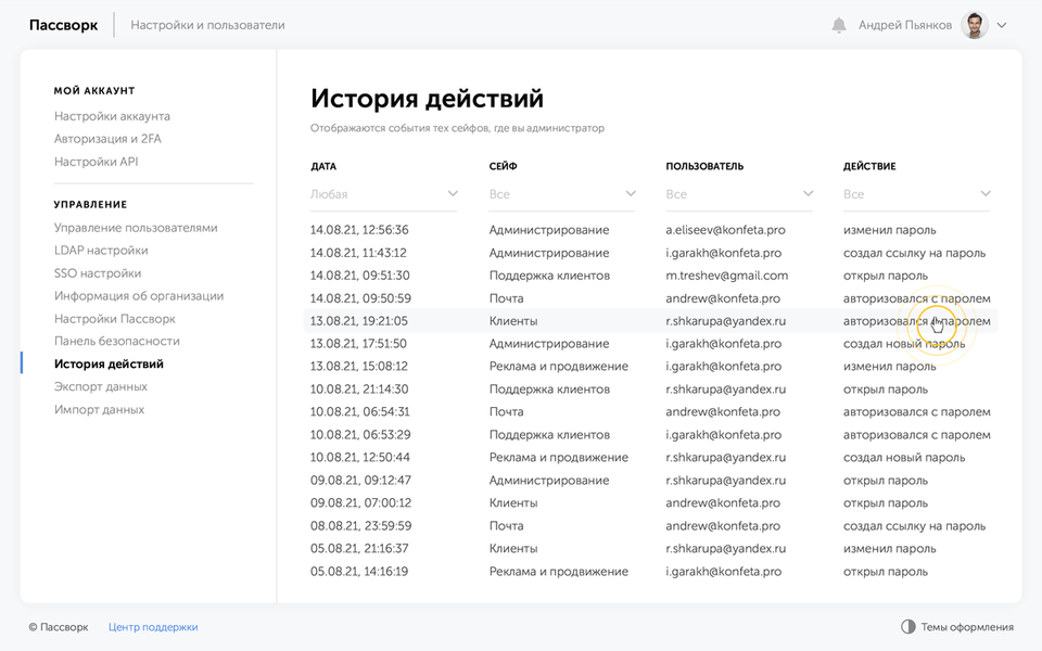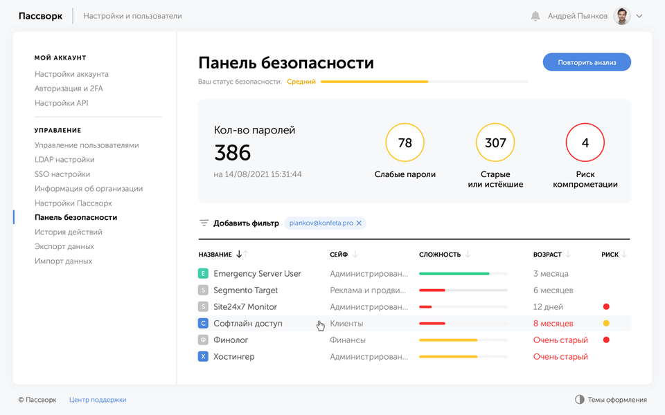 Когда сотрудник увольняется, Пассворк отметит пароли, к которым он имел доступ и предложит их заменить. Вы можете быстро провести аудит безопасности и увидеть: