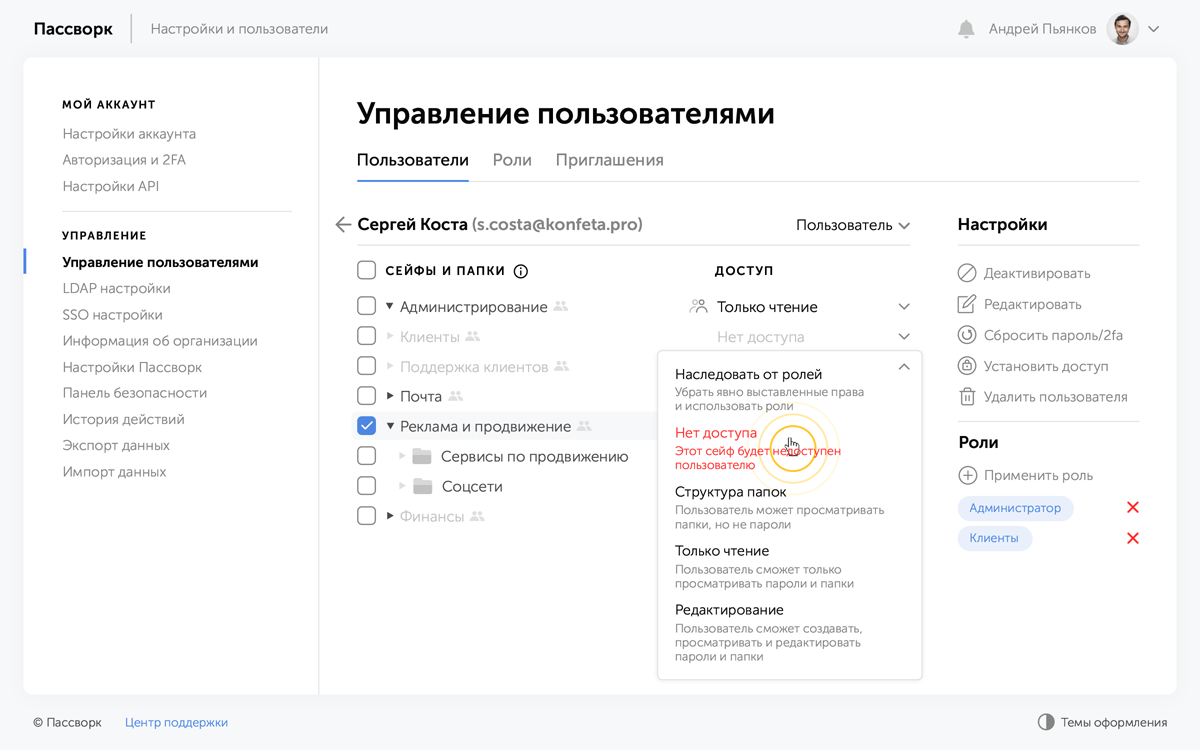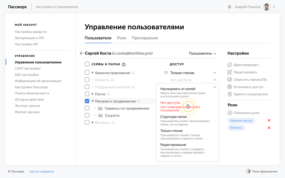 В Пассворке вы храните пароли в папках, добавляете в них пользователей и устанавливаете права доступа. Все данные хранятся на сервере вашей компании, не передаются в облако, а значит доступ есть только у вас.