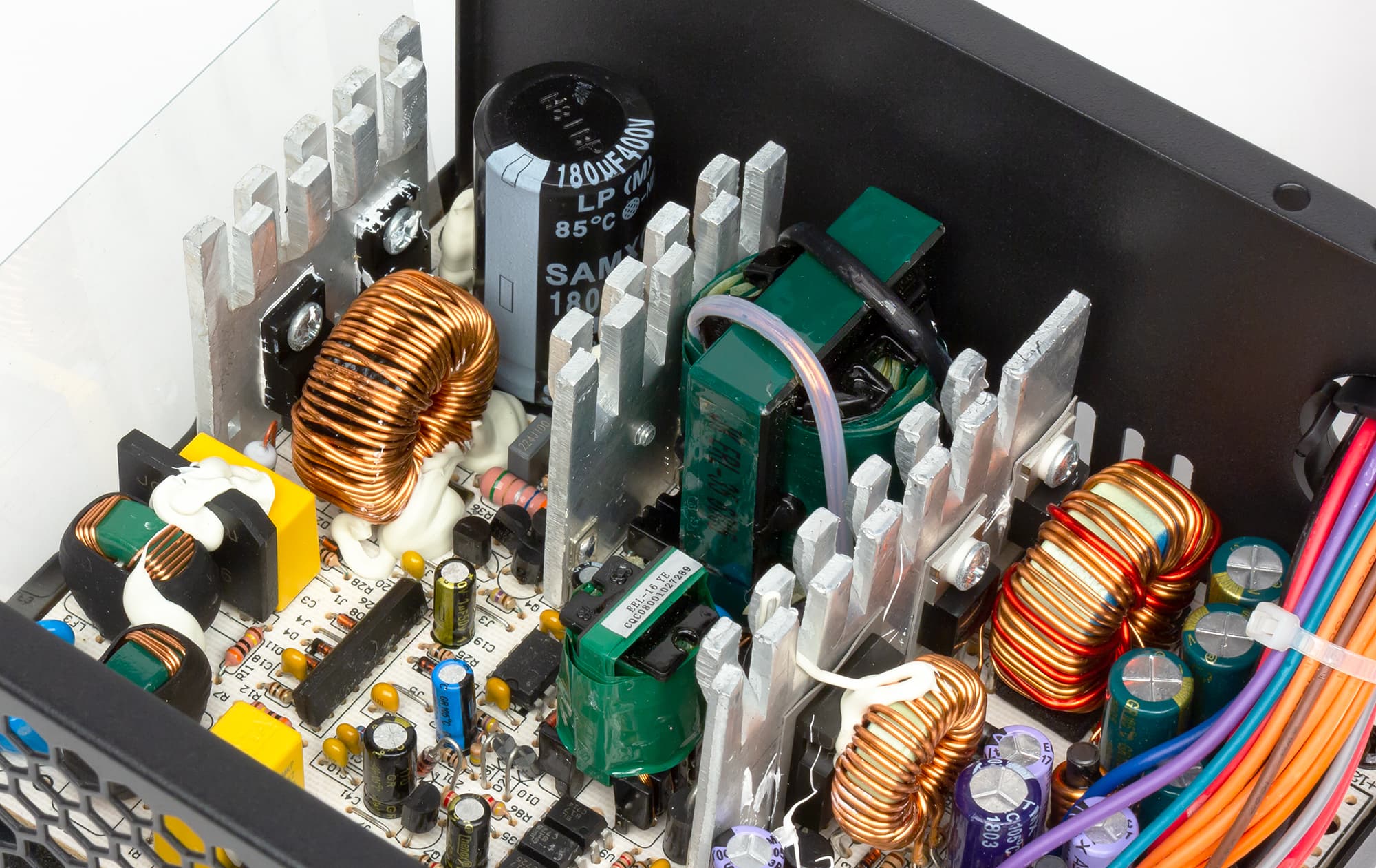 Фильтр электромагнитных помех на входе питания состоит из двух конденсаторов CX (один на входе шнура питания), четырех конденсаторов CY (два на входе шнура питания) и трех синфазных дросселей.