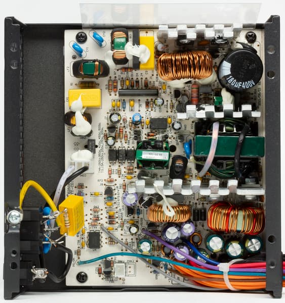 Блок питания QDION QD400 80+ сконструирован на платформе с групповой стабилизацией напряжений, но при этом выделяется активной коррекцией фактора мощности (об этом свидетельствует дроссель поблизости от входного конденсатора производства гонконгской компании SAMXON), что является неожиданностью в моделях бюджетного ценового сегмента.