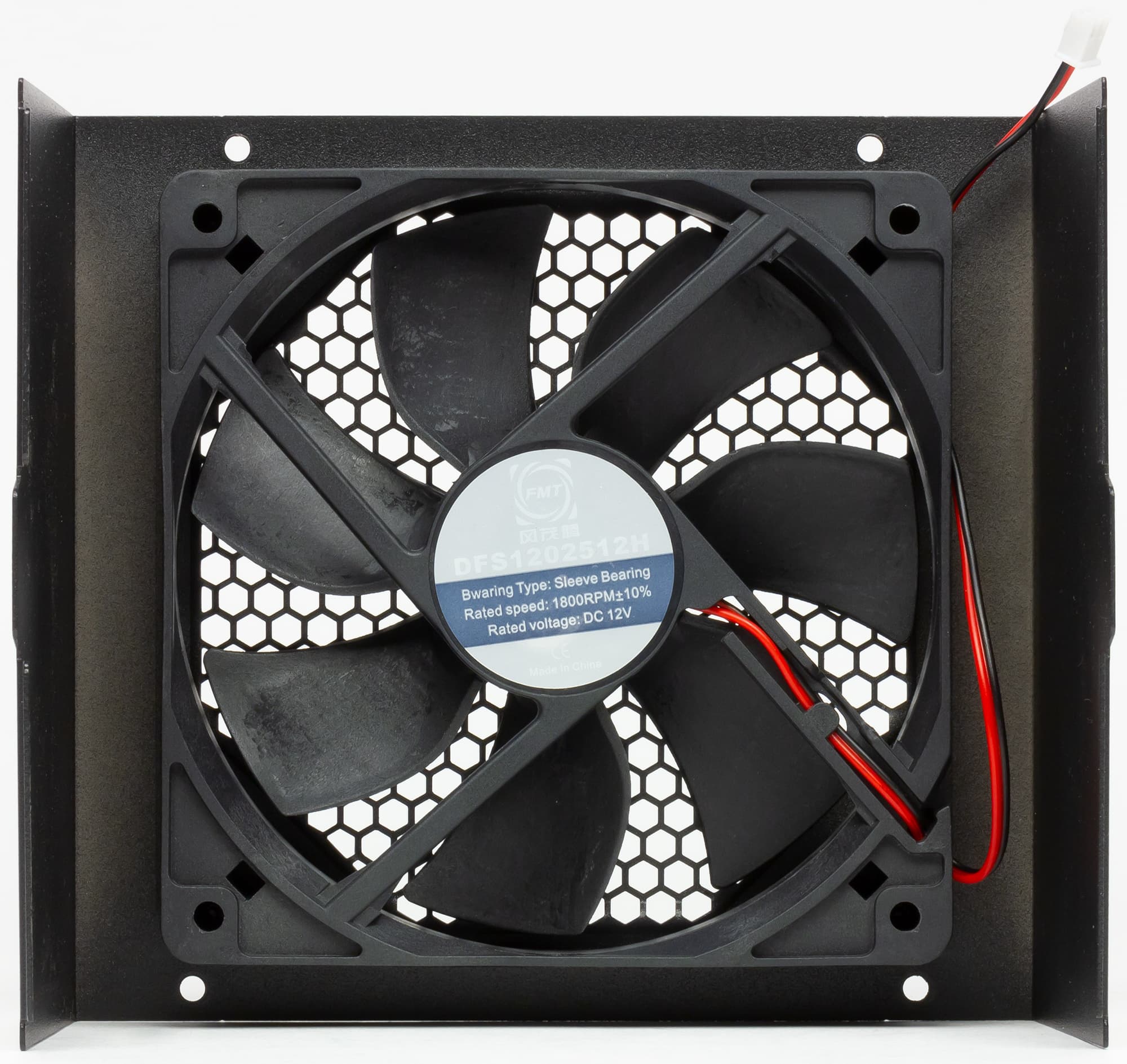 Для поддержания нормального температурного баланса внутри блока питания используется семилопастной вентилятор FD12S12025H китайского производителя (Shenzhen Fengmao Teng Technology Co., Ltd.), который специализируется на выпуске вентиляторов. Данный вентилятор имеет высокую скорость вращения до 1800 RPM, что позволяет ему прогонять весьма приличные объемы воздуха (CFM = 67,60). Поэтому перегрева элементов внутри блока питания точно можно не опасаться.