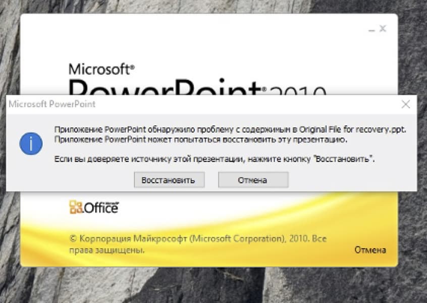 Итак, если проблема уже случилась, необходимо начать проверку диска. Для этих целей можно использовать стандартную программу от Windows. В процессе проверки обнаружены ошибки? Необходимо скопировать файл на основной диск, попробовать его открыть — должно получиться. Если же «виноват» не диск, а презентация (*.ppt/.pptx), самое время применить предусмотренные для этого средства «реанимации» PowerPoint. При использовании свежей версии программы «капризный» файл (если проблемы несерьезные) может быть «вылечен» в считанные минуты. Для этого нужно дважды кликнуть по нему и дождаться загрузки программы. Когда появится диалоговое окно с иконкой «Восстановить», воспользуйтесь щедрым предложением проги. Пересохраните документ, порадуйтесь результату.