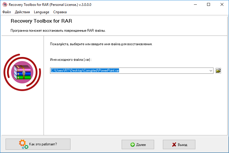 - выбрать поврежденный архив в RAR-формате для начала работы;
