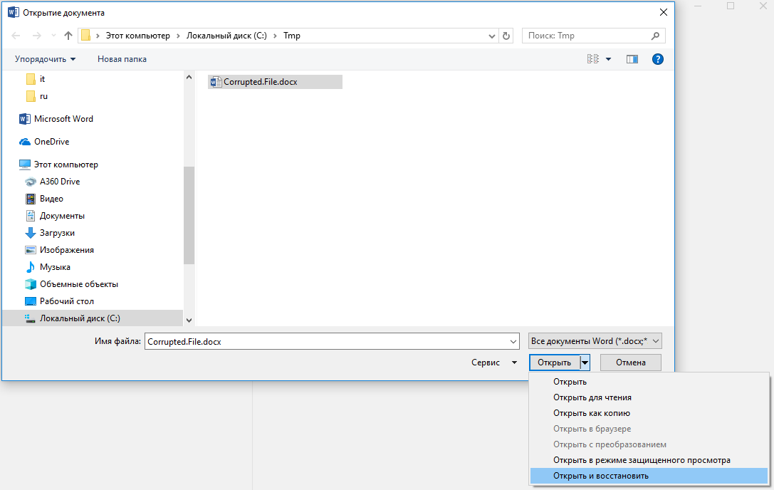 Третий метод заключается в использовании встроенной в офисный пакет утилиты для восстановления. Чтобы ей воспользоваться, нужно опять создать документ Word, открыть его. Перейти в меню «Файл» (File). Во всплывшем окне указываем путь к поврежденному документу, затем нажимаем на стрелку возле «Открыть» (Open). Затем выбираем опцию «Открыть и восстановить». Готово.