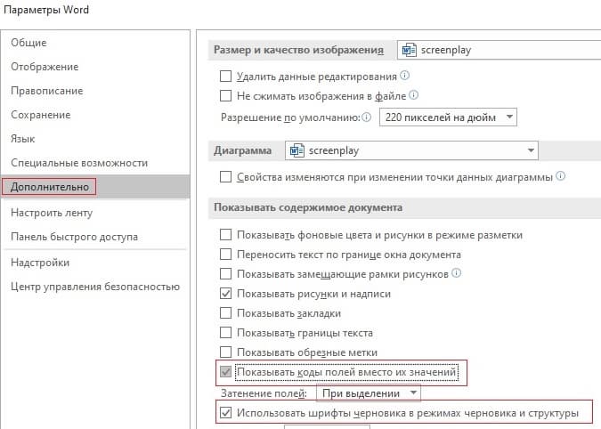 - В том же разделе ставим галочку напротив «Показывать коды полей вместо их значений» (или Show Picture Placeholders)
