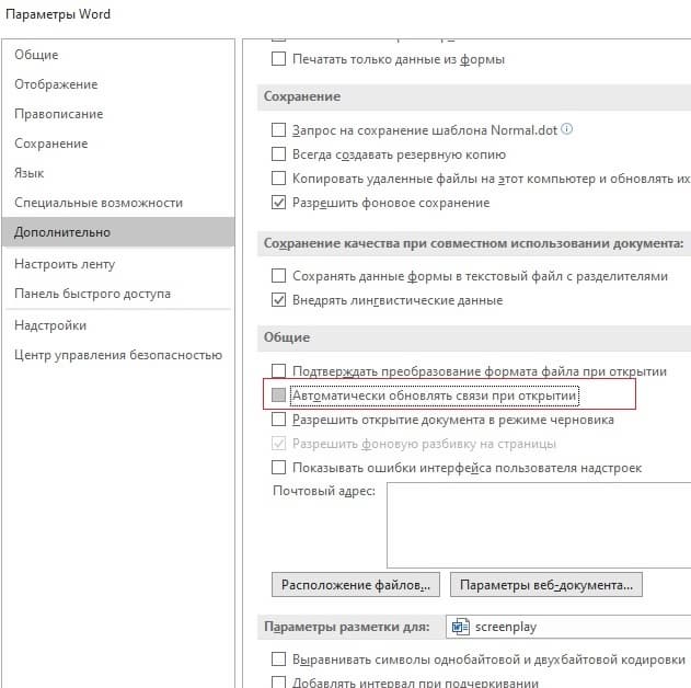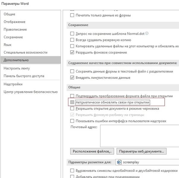 - Прокручиваем раздел «Общие» (или General) до самого конца, и снимаем галочку напротив пункта «Автоматически обновлять связи при открытии» (или Update automatic links at Open).