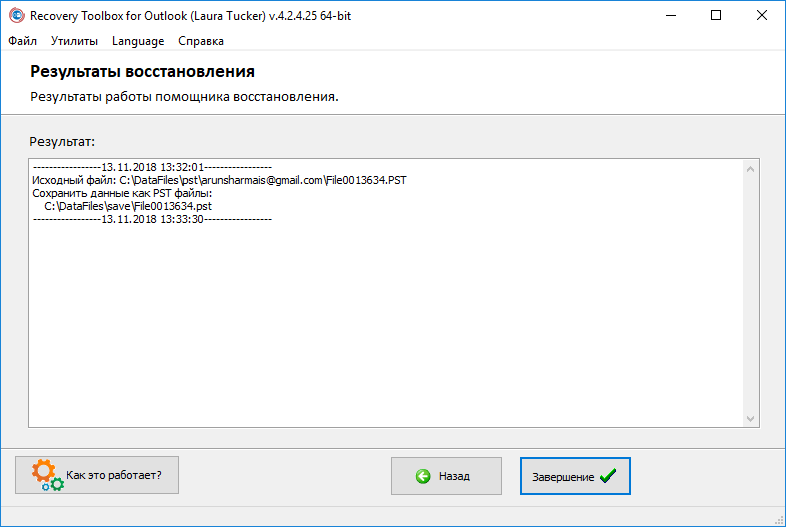 11. Вот и все! Вы успешно восстановили данные из поврежденного файла PST. На последней странице будет отображен журнал процесса восстановления.