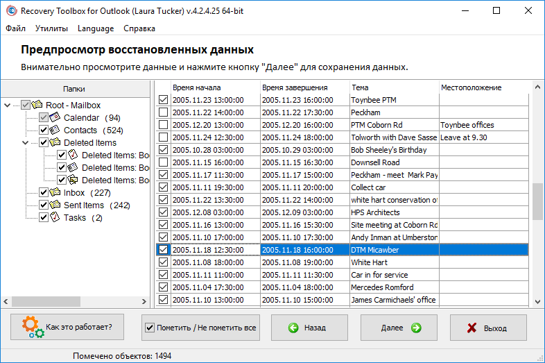8. Затем инструмент отобразит данные, возможные к восстановлению. Для анализа всего файла утилите потребовалось ровно шестнадцать минут. Если вы нажмете на любую из папок слева, он справа откроется список всех объектов, которые будут восстановлены в этой папке. Я нажал на папку «Календарь», и инструмент отобразил в общей сложности девяносто четыре элемента календаря, которые будут в итоге восстановлены.