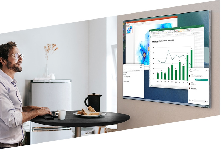 Samsung Neo QLED 4K 2021 может легко превратиться в рабочий инструмент благодаря поддержке удалённого подключения к компьютерам под управлением Windows 10 Professional или macOS 10.5 и новее. Кроме того, к ТВ можно подключить и смартфон: для удобного подключения предназначено приложение SmartThings, с помощью которого телевизор автоматически обнаружит и подключит все совместимые устройства. А благодаря функции Multi View экран телевизора можно разделить на две части, в каждую из которых можно выводить свой контент.