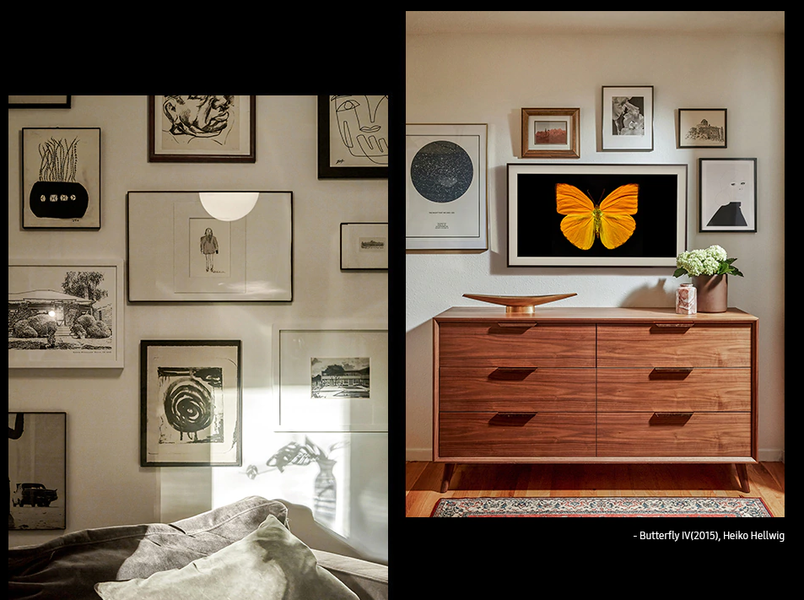 Экспериментируйте с цветом. Проявите креативность и не бойтесь экспериментировать с контрастными цветами. Сочетайте разные оттенки элементов декора или повесьте одну, но яркую картину на белую стену. Кстати, правильное оформление картины так же важно, как и она сама. Кирстен рекомендует присмотреться к телевизору The Frame: с ним вы сможете в одно нажатие выбирать произведения искусства и дополнять их сменными рамками. Samsung The Frame на российском рынке доступен в шести вариантах: с диагональю экрана 32”, 43”, 50”, 55”, 65” и 75” — так что можно подобрать подходящий под любое помещение вариант.