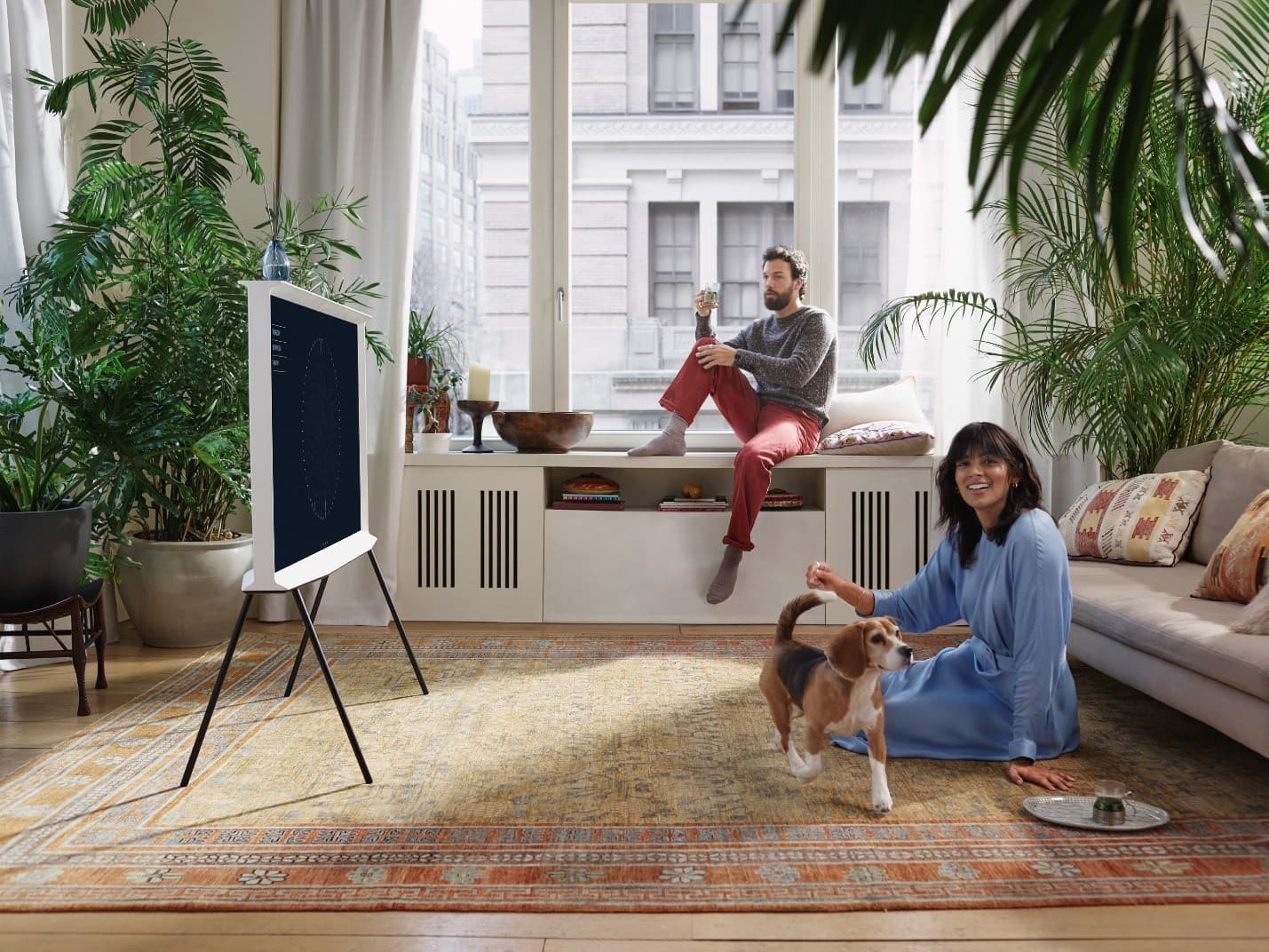 Оригинальный дизайн телевизора The Serif позволяет рассматривать его в качестве арт-объекта, который не затеряется в любом, даже самом изысканном интерьере. Главная «фишка» телевизора – оригинальная подставка, позволяющая разместить его в любом месте комнаты, и никаких дополнительных аксессуаров для этого не потребуется. При этом убранство интерьера не нарушится торчащими кабелями, ведь задняя текстурированная панель The Serif скрывает все интерфейсы и провода. Кроме того, особый интерьерный режим Ambient позволит Samsung The Serif дополнить фактуру стены, у которой он расположен. В этом режиме телевизор также способен показывать текущее время, демонстрировать прогноз погоды, показывать фотографии или загруженные произведения искусства.