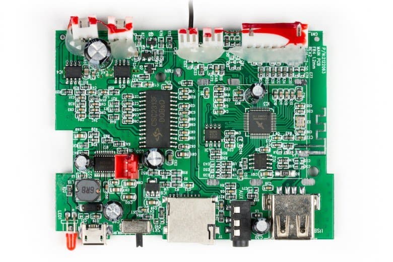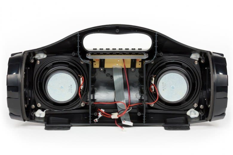 На передней панели расположена защитная металлическая решетка черного цвета, под которой находится два динамика диаметром 95 миллиметров, обеспечивающих воспроизведение звука в диапазоне частот от 100 Гц до 20 кГц. В верхней части фронтальной панели расположен дисплей с красной подсветкой средней яркости, на котором отображается информация о выбранном источнике звука, уровне заряда аккумулятора, настраиваемом диапазоне частот при смене установок эквалайзера, уровне громкости при его регулировке, частоте FM-станции, входящем звонке и номере трека при переключении. А теперь посмотрим на внутренности устройства: