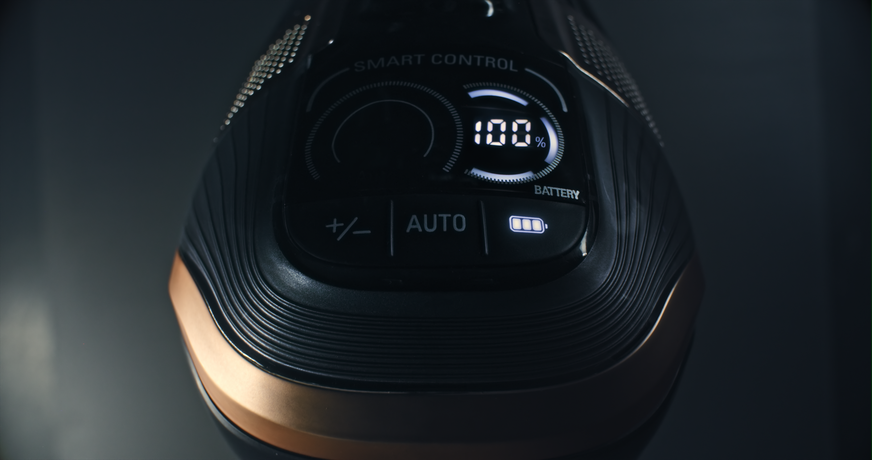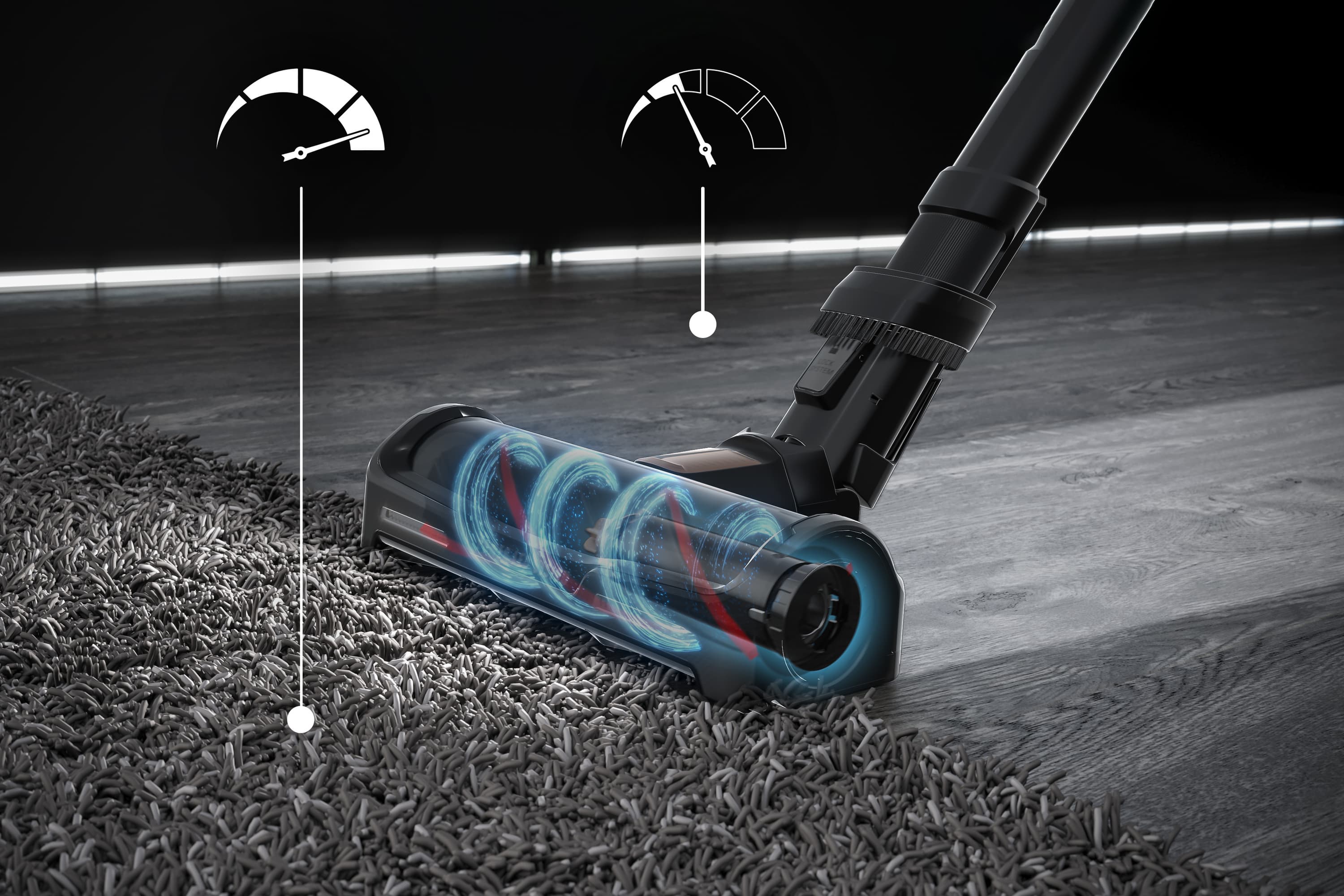 При выборе на панели управления авторежима встроенный в насадку датчик распознает тип поверхности - гладкий пол или ковровое покрытие, и в зависимости от этого пылесос сам выбирает необходимую скорость работы - то есть силу воздушного потока. Благодаря этому пользователь освобождается от необходимости следить за процессом и переключать скорости работы, но и оптимизируется расход заряда аккумулятора. Впрочем, у пользователя есть и альтернатива: режим уборки можно выбрать вручную, увеличивая или уменьшая мощность всасывания при помощи клавиш “плюс” и “минус” на корпусе и настроив таким образом экорежим для несложных загрязнений, максимальный - для более сложных и турборежим - для самых въевшейся грязи на ковровых поверхностях.