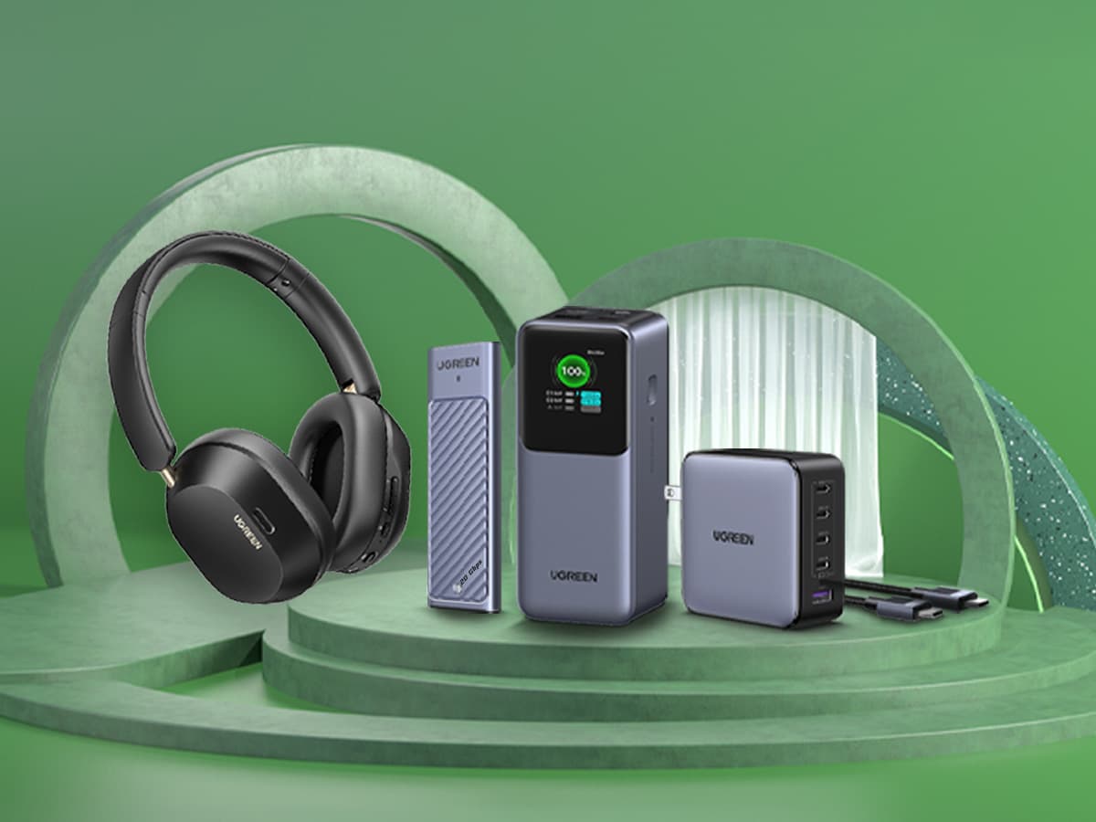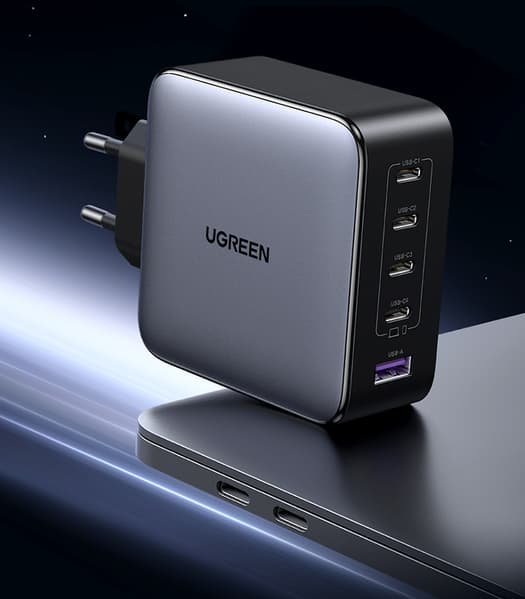 "Ugreen 100W-5 Ports GaN Fast Charger" — это зарядное устройство оснащено четырьмя портами USB-C и одним USB-A, что делает его универсальным решением для зарядки различных гаджетов. Технология с использованием нитрида галлия (GaN) позволяет уменьшить размеры зарядного устройства без потери эффективности.