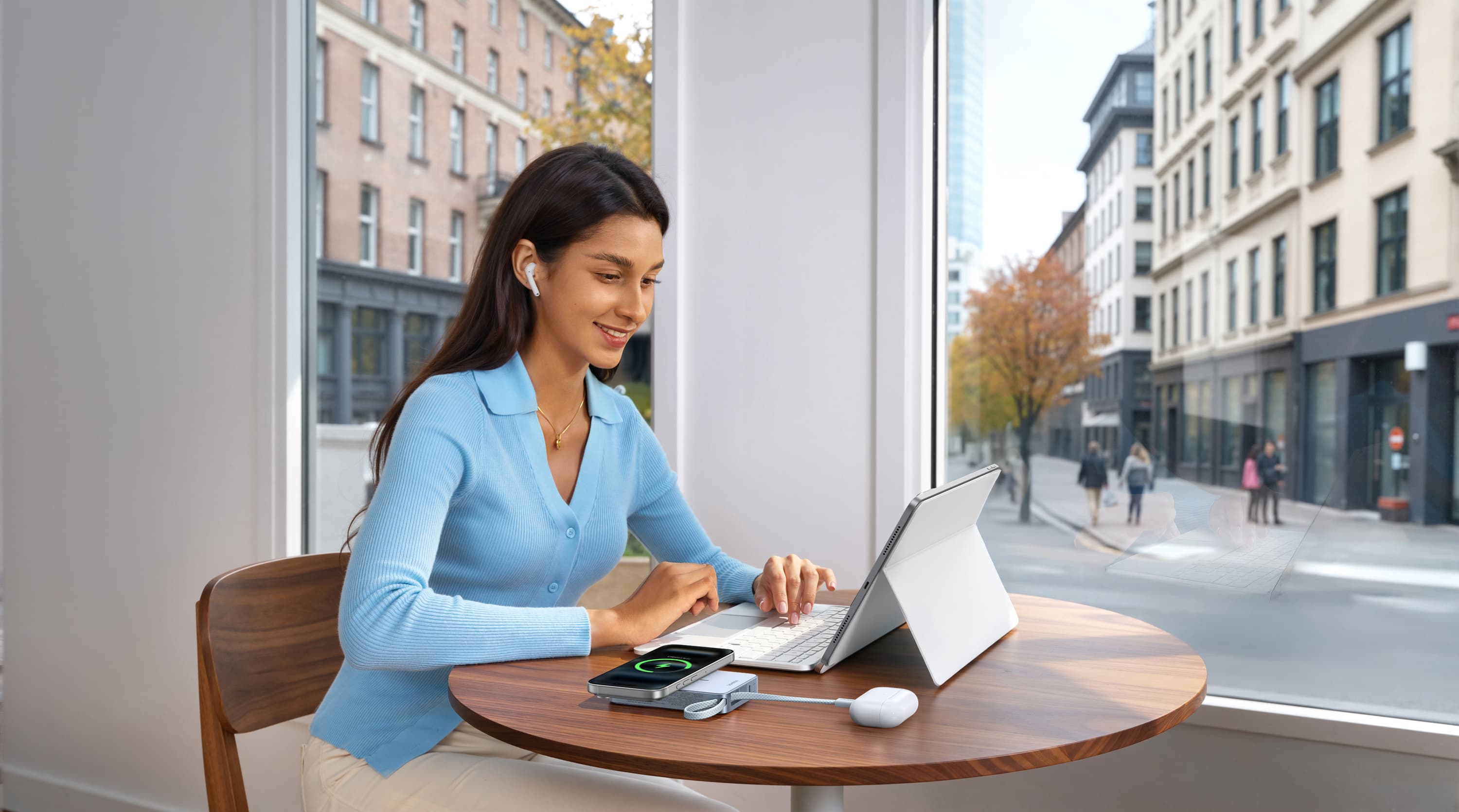Флагман нового семейства с магнитным выравниванием Qi2 (мощность зарядки до 25 Вт на свежих iPhone) и наглядным экранчиком. Одновременно заряжает три устройства — у него есть магнитная «площадка» с поддержкой Qi2, встроенный кабель USB-C и разъём USB-C. Мощные магниты очень прочно удерживают аккумулятор на смартфоне — силой 9 Н (примерно соответствуют 900 г веса).