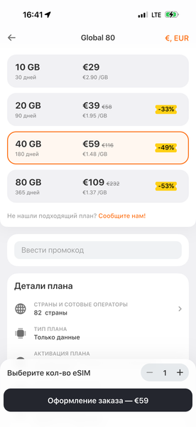 Есть два готовых набора стран: 147 стран или 82 страны. Они отличаются охватом, также объёмами трафика и сроками действия: от 10 ГБ на 30 дней до 80 ГБ на год. Чем старше пакет, тем, разумеется, дешевле обходится каждый гигабайт.