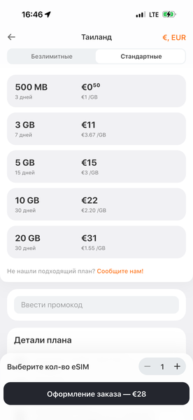 Отдельно стоит отметить, что у части стран и регионов в списке стандартных пакетов (то есть с объёмом данных) есть «пробничек» для тестирования качества связи: за пол-евро (то есть около 50 рублей) можно получить 500 МБ трафика.