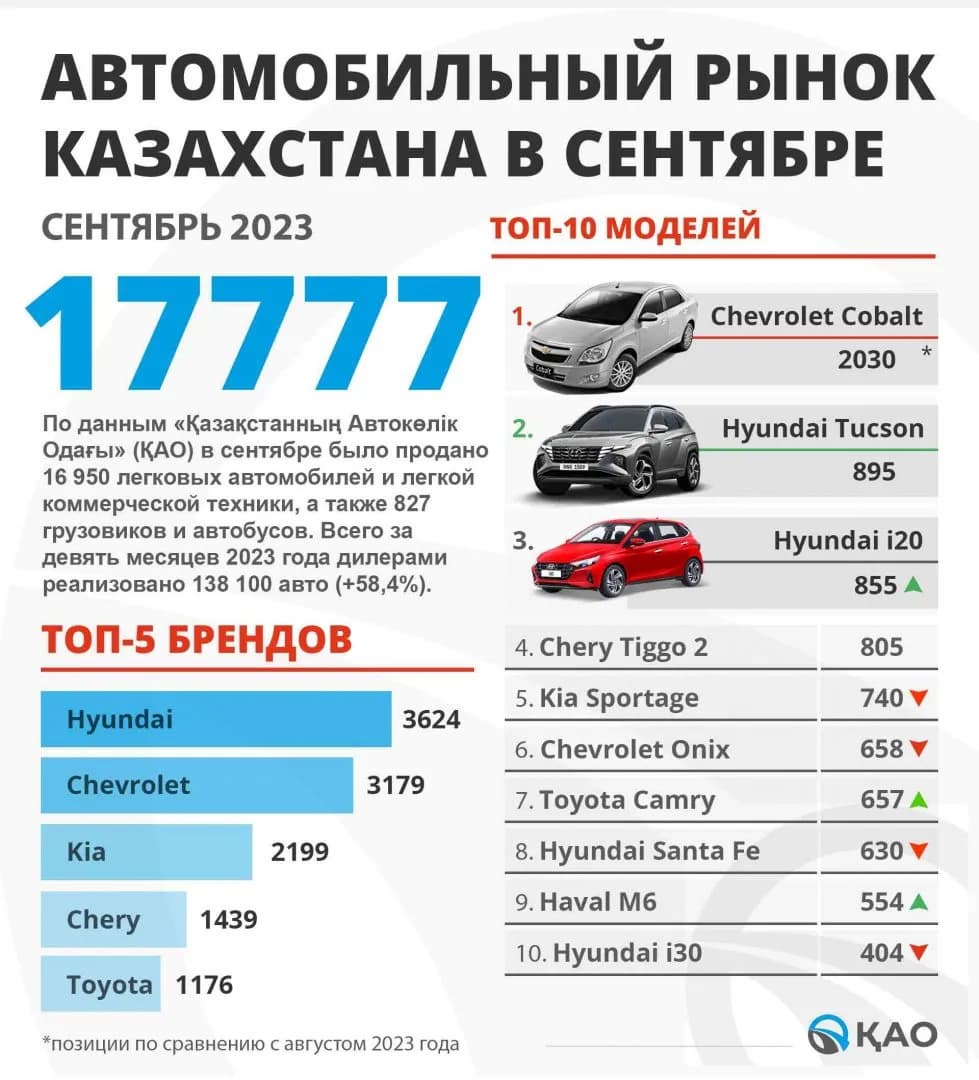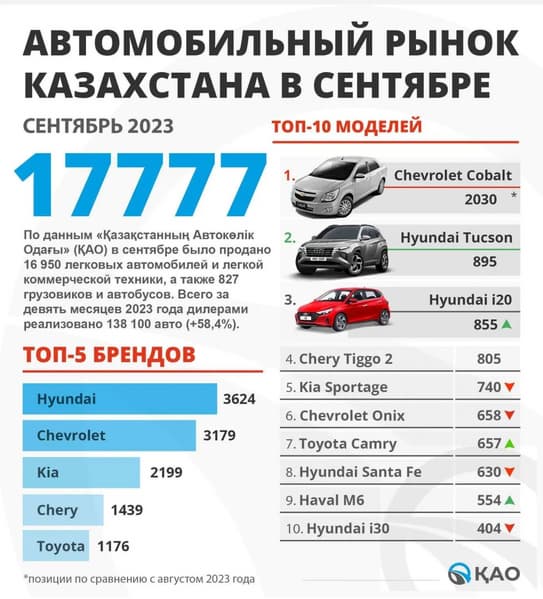 В сентябре в Казахстане было продано 855 Hyundai i20. В топ-3 вошли также Hyundai Tucson (895 машин) и Chevrolet Cobalt (2030 машин). В топ-10 из моделей Hyundai-Kia присутствуют Kia Sportage, Hyundai Santa Fe и Hyundai i30.
