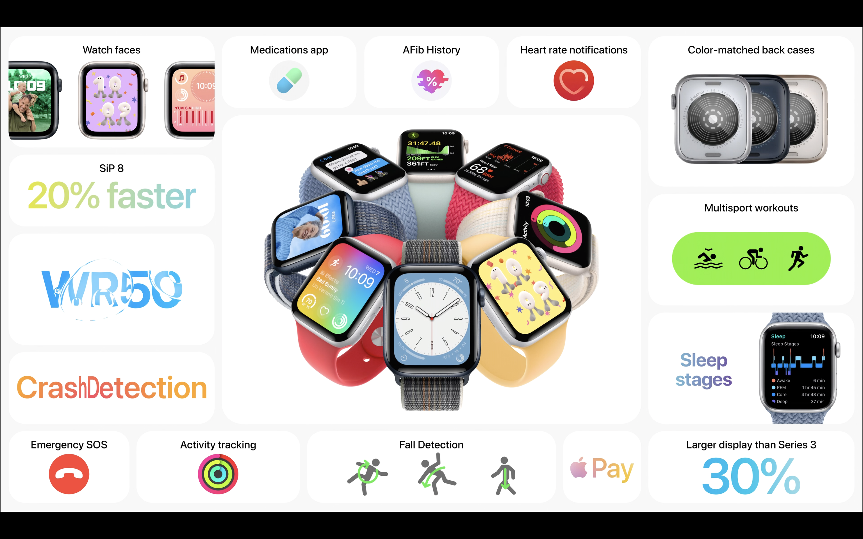 Наряду с Watch Series 8 были представлены и новые Watch SE. Но это уже совсем странное обновление. По сути, обновился лишь чип — теперь он такой же, как в Series 8, и Apple утверждает, что это дает прирост производительности на 20%.