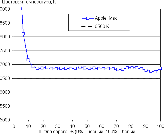Баланс оттенков на шкале серого очень хороший, так как цветовая температура близка к стандартным 6500 К, а отклонение от спектра абсолютно черного тела (ΔE) меньше 10, что для потребительского устройства считается приемлемым показателем. При этом цветовая температура и ΔE мало изменяются от оттенка к оттенку — это положительно сказывается на визуальной оценке цветового баланса. (Самые темные области шкалы серого можно не учитывать, так как там баланс цветов не имеет большого значения, да и погрешность измерений цветовых характеристик на низкой яркости большая.)