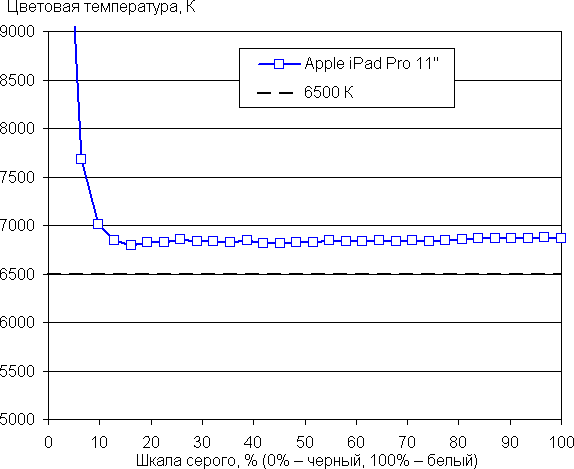 Присутствует функция True Tone, которая, если ее включить, подстраивает цветовой баланс под условия окружающей среды. К примеру, мы ее активировали и поместили планшет под светодиодные светильники с холодным белым светом, получив в итоге значения 5,5 для ΔE и 6900 К для цветовой температуры. Под галогеновой лампой накаливания (теплый свет) эти показатели составили 3,5 и 6050 К, то есть цветовая температура стала ниже. Функция работает так, как и ожидалось. Отметим, что сейчас сложившимся стандартом является калибровка устройств отображения к точке белого в 6500 К, но в принципе, коррекция под цветовую температуру внешнего света может принести пользу, если хочется добиться лучшего соответствия изображения на экране с тем, что видно на бумаге (или на любом носителе, на котором цвета формируются за счет отражения падающего света) в текущих условиях.