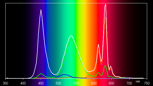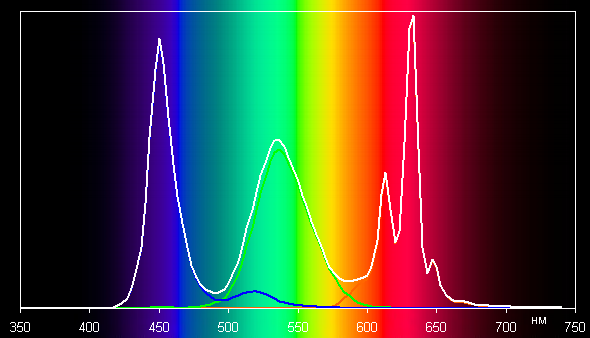 Отметим, что координаты первичных цветов практически в точности совпали с теми, что прописано для стандарта DCI-P3. Смотрим на спектры в случае тестовых изображений с профилем Display P3:
