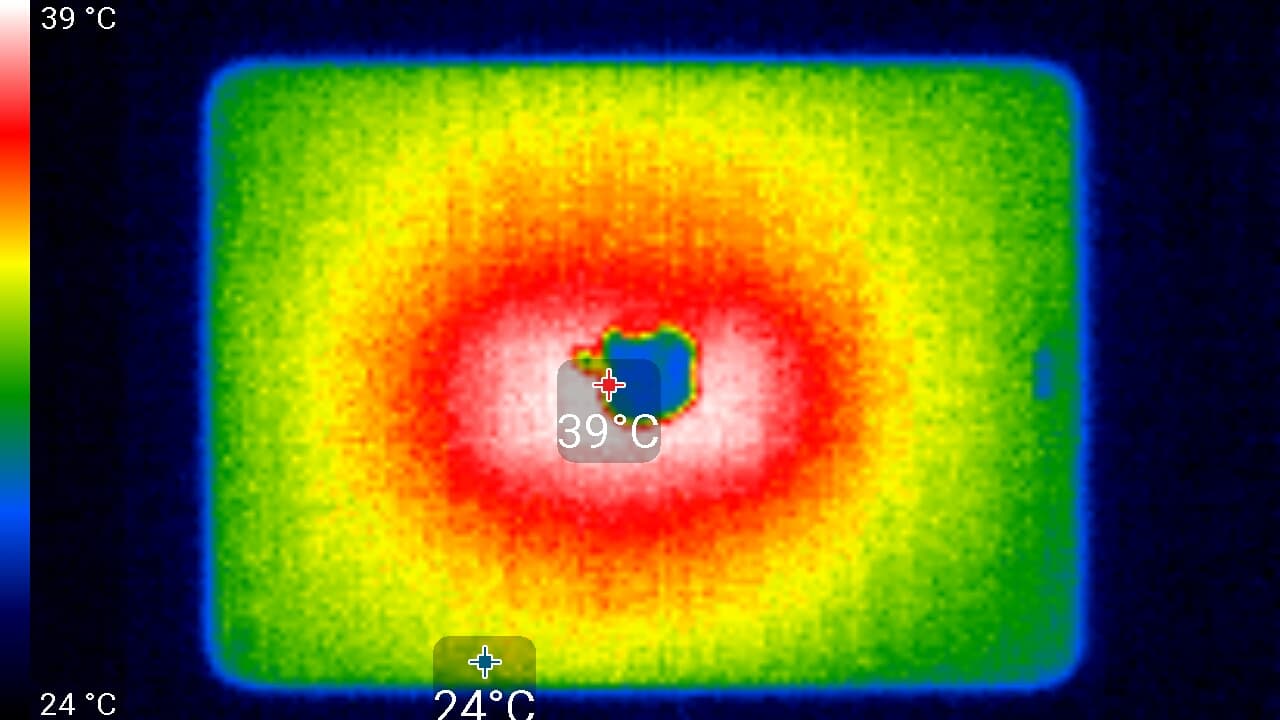 Видно, что нагрев локализован примерно по центру, что соответствует расположению микросхемы SoC. По данным теплокамеры, максимальный нагрев составил 39 градусов (при температуре окружающего воздуха в 24 градуса). Впрочем, данный тест выполняется на планшете очень быстро, времени непрерывной работы явно не хватает, чтобы хорошенько прогреть устройство.