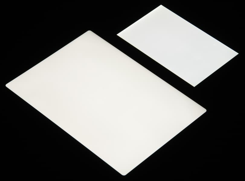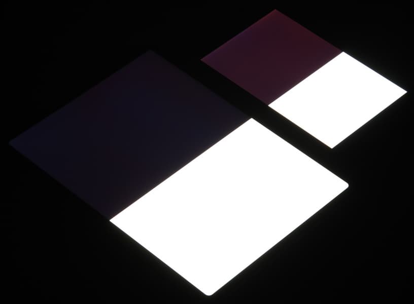 Яркость под углом у экранов уменьшилась (как минимум в 5 раз, исходя из разницы в выдержке), но в случае iPad Pro 11″ падение яркости меньше. Черное поле при отклонении по диагонали высветляется очень слабо и приобретает фиолетовый оттенок. Фотографии ниже это демонстрируют (яркость белых участков в перпендикулярном плоскости экранов направлении примерно одинаковая!):