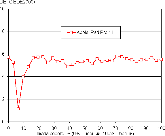 Баланс оттенков на шкале серого хороший, так как цветовая температура близка к стандартным 6500 К, а отклонение от спектра абсолютно черного тела (ΔE) меньше 10, что для потребительского устройства считается приемлемым показателем. При этом цветовая температура и ΔE мало изменяются от оттенка к оттенку — это положительно сказывается на визуальной оценке цветового баланса. Характер изменения величин от оттенка к оттенку косвенно показывает, что используется программная коррекция цветопередачи. (Самые темные области шкалы серого можно не учитывать, так как там баланс цветов не имеет большого значения, да и погрешность измерений цветовых характеристик на низкой яркости большая.)
