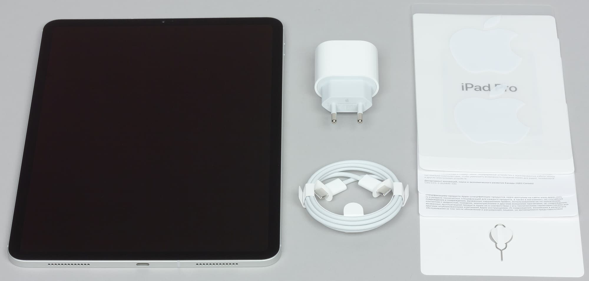 Обратим внимание, что, во-первых, вместе с iPad впервые идет такая мощная зарядка, во-вторых, кабель теперь USB-C, а не проприетарный Lightning, следовательно, никто не мешает использовать сторонние кабели, и в-третьих, здесь отсутствует переходник для подключения проводной гарнитуры, хотя разъема 3,5 мм больше нет. Это, конечно, минус.