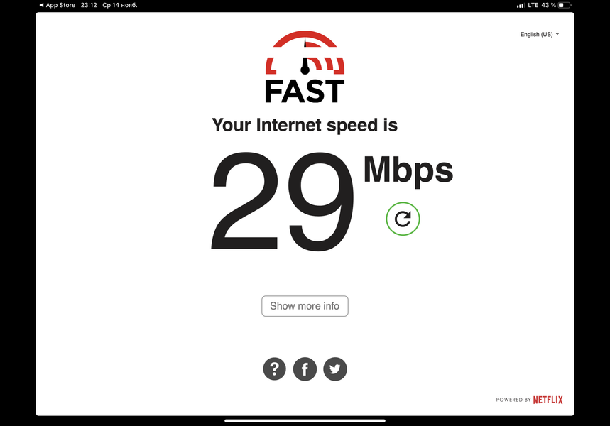 Подчеркнем, что хотя LTE теперь гигабитный, практическую пользу от этого с российскими операторами мы вряд ли почувствуем. Ниже — результат теста в программе Fast, разработанной Netflix для теста скорости интернет-соединения, полученный при работе с SIM-картой Beeline.