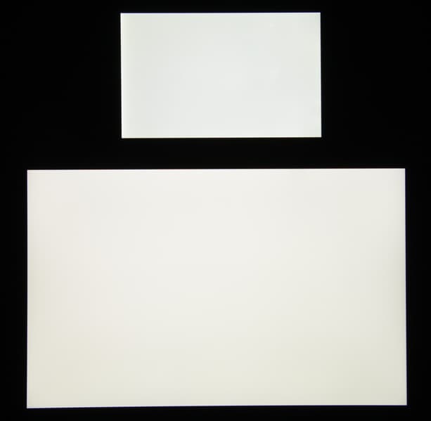Яркость под этим углом у обоих экранов заметно уменьшилась (выдержка увеличена в 5 раз), но экран MacBook Air все же светлее. Черное поле при отклонении по диагонали высветляется слабо и приобретает легкий фиолетовый оттенок. Фотография ниже это демонстрирует (яркость белых участков в перпендикулярном плоскости экранов направлении примерно одинаковая!):