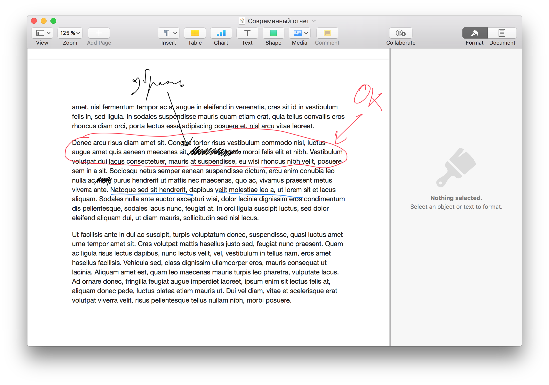 Далее мы рисуем прямо поверх текста. В общем-то, не сказать, что это что-то революционное, подобные вещи есть и у конкурентов, но радует, что они теперь стали доступны в iWork для iPad. И, что особенно приятно, если открыть сохраненный файл на MacBook или iMac, мы увидим там точно такое же расположение всех пометок. Сравните: сначала — скриншот с iPad, затем — c MacBook.