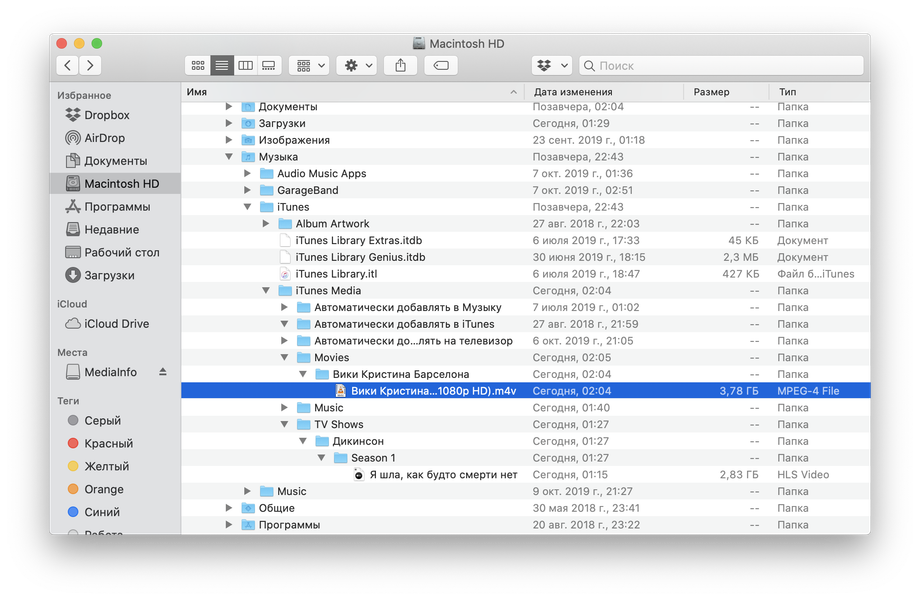 Обратите внимание, что некоторые фильмы, купленные ранее в iTunes, по-прежнему загружаются в старом добром M4V. На скриншоте ниже — файл «Вики Кристина Барселона», загруженный непосредственно во время написания этой статьи.