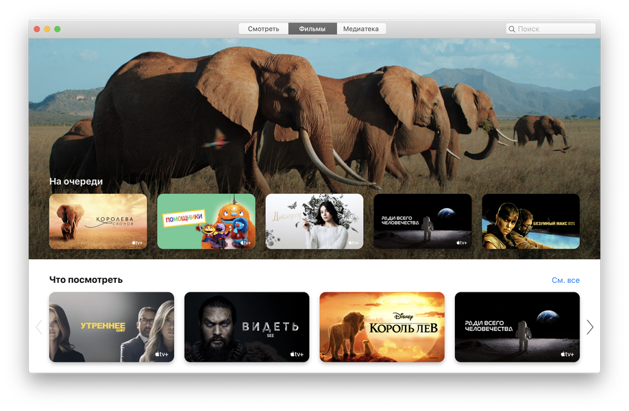 Однако важно понимать, что это приложение не только для Apple TV+, но и для всего видеоконтента из бывшего магазина iTunes. Следовательно, помимо сериалов по подписке там есть и отдельные фильмы за отдельную плату, и ваша медиатека, включающая прошлые покупки кино в iTunes. На скриншоте ниже видны несколько проектов Apple TV+ (на них есть соответствующие значки), но есть также «Король Лев» (он не имеет отношения к сервису, его надо покупать) и «Безумный Макс» (он уже куплен и тоже не связан с Apple TV+). Меню «На очереди» — это то, что мы уже начали смотреть (неважно, из Apple TV+ этот контент или нет, а также на этом ли устройстве был просмотр или на другом).