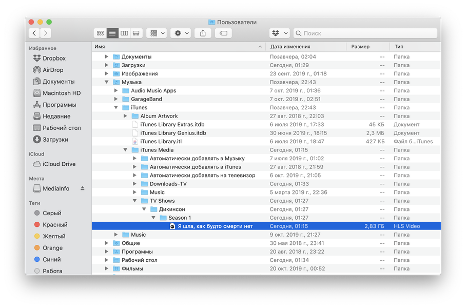 Если же вы загружаете фильм (пока он в Apple TV+ только один, но позже появятся и другие), то у него адрес будет немного иным: Macintosh HD/Пользователи/имя пользователя/Музыка/iTunes/iTunes Media/Downloads-TV/название фильма. И вот что интересно: файловый формат теперь — HLS Video. Ни одним плеером, кроме Apple TV+, он не воспроизводится, и даже получить информацию о разрешении, кодеке и прочих параметрах нам не удалось — ни встроенными, ни сторонними средствами.