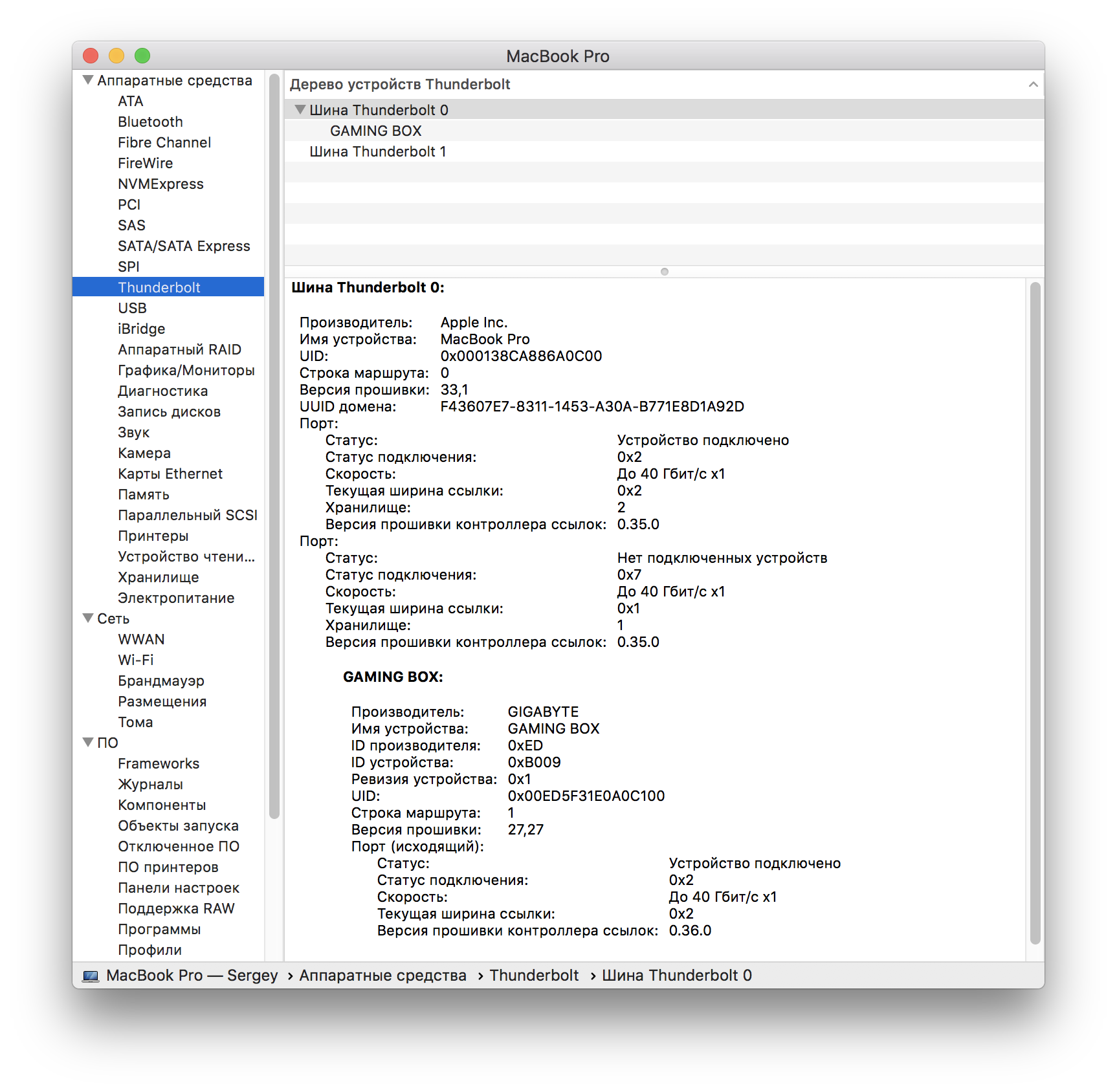 Следовательно, видеокарта уже подключена. И проверить это можно, зайдя в «Этот Мак» → «Отчет о системе». Там нас интересует два пункта. Во-первых, Thunderbolt. И здесь видим Gaming Box.