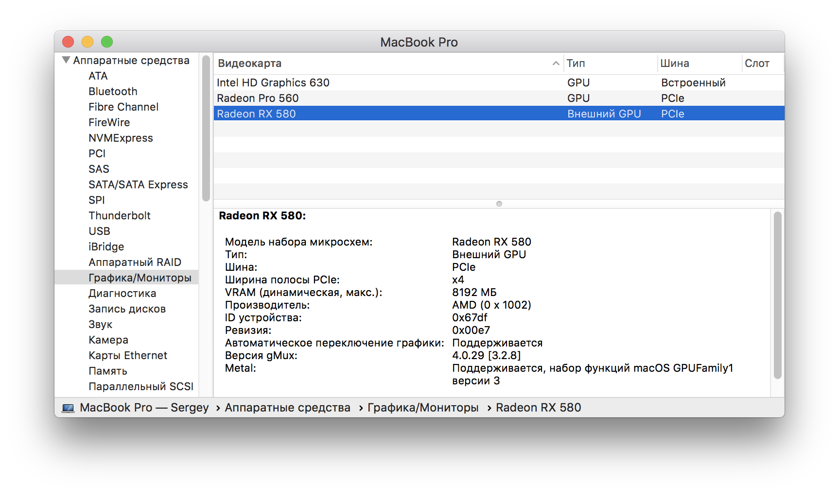 И там наряду с интегрированной Intel HD Graphics 630 и дискретной Radeon Pro 560 отображается также Radeon RX 580 с пометкой «Внешний GPU». Итак, все работает, причем безо всяких драйверов и прочих усилий со стороны пользователя. Важно также отметить, что пользователю не нужно вручную переключать компьютер на работу с внешней видеокартой: при ее подсоединении она автоматически становится приоритетной.