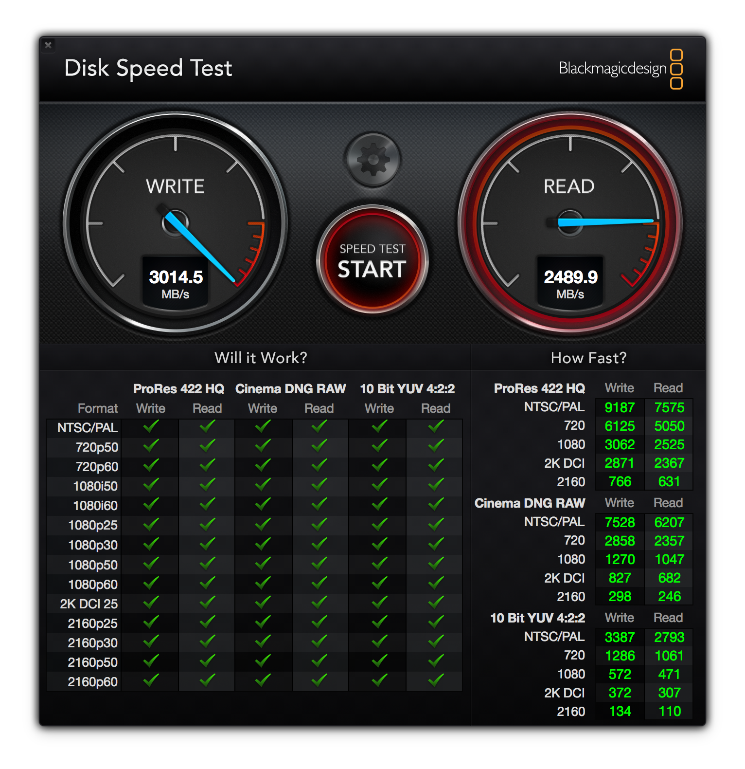 Если перечисленные выше бенчмарки помогают нам оценить производительность CPU и GPU, то BlackMagic Disk Speed ориентирован на тестирование накопителя — скорости чтения и записи файлов.
