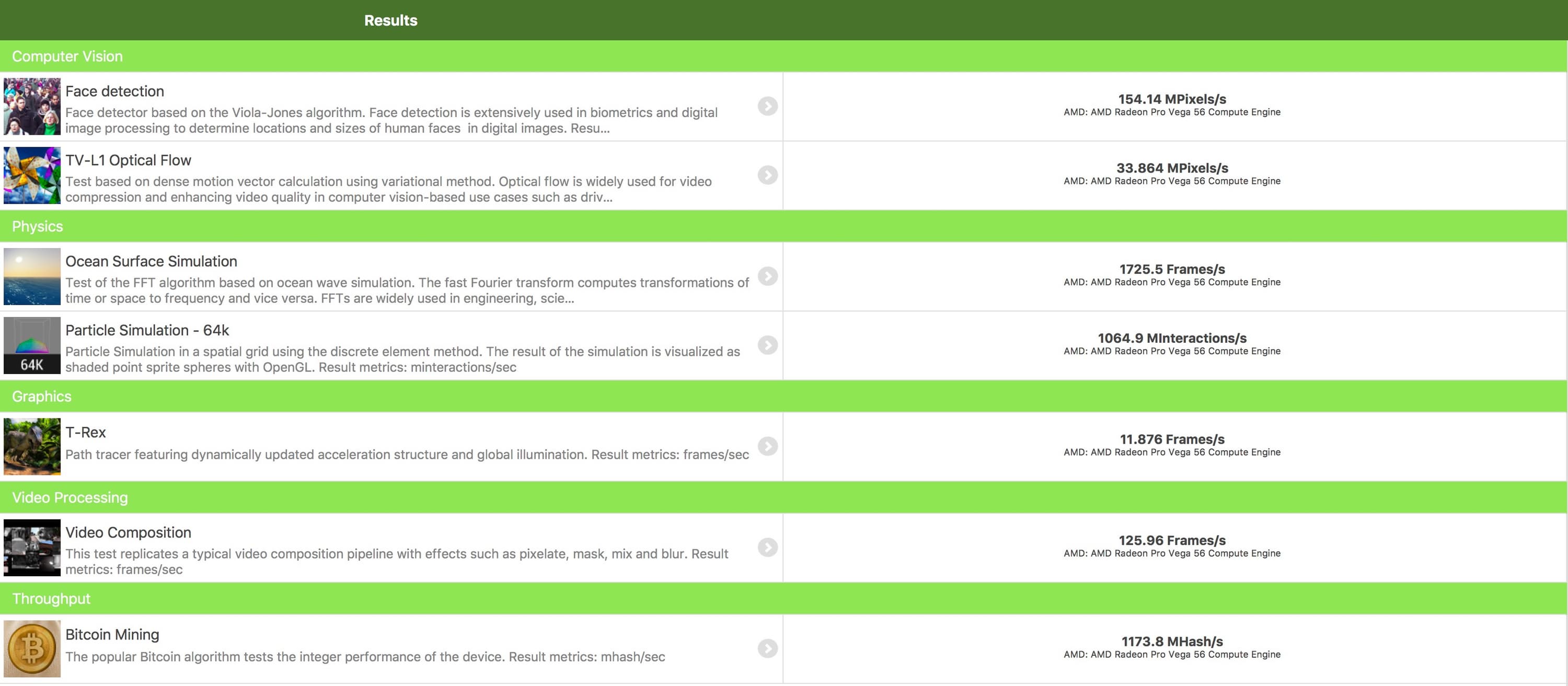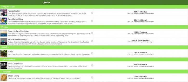 | CompuBenchCL | iMac Pro (Late 2017) | iMac 27″ (Mid 2017) | MacBook Pro 15″ (Late 2016) |